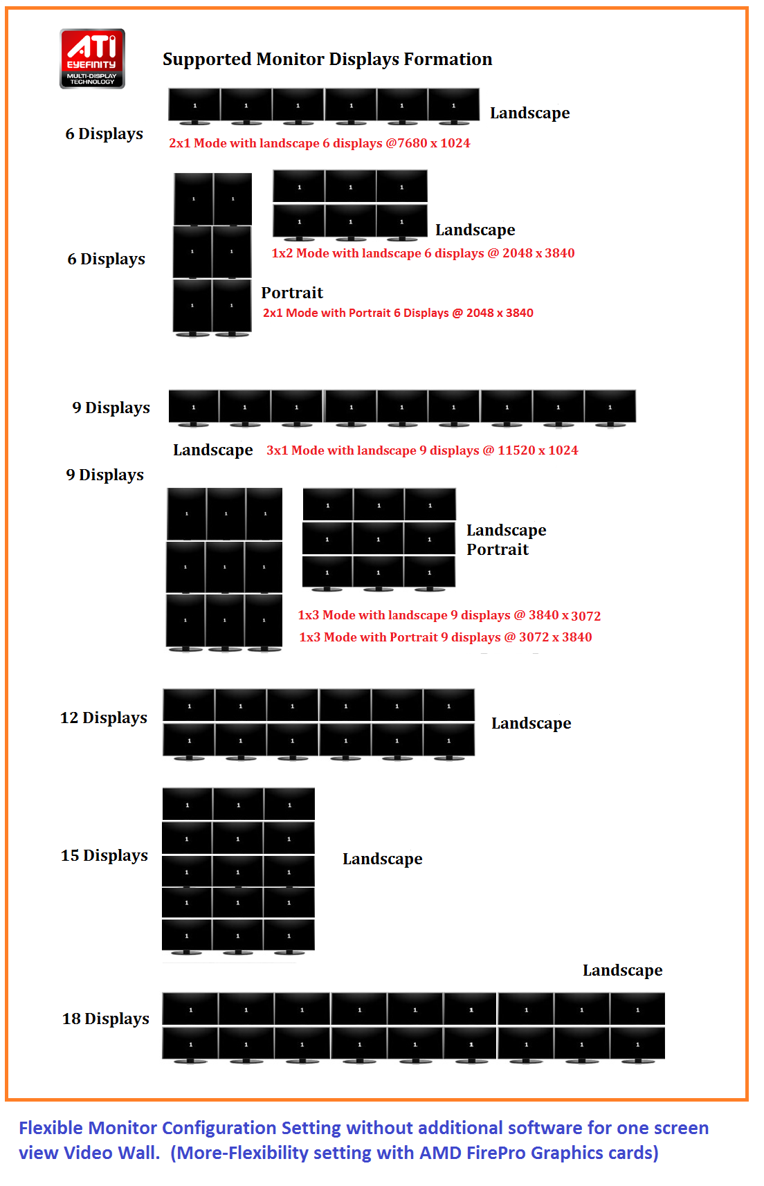 - Easy to configure and add up to 3 ,6 displays per hub or configure Eyefinity mode up to 9x, 12x, 15x and "Maximum 18 Displays" in one resolution for commercial digital signage without additional software.